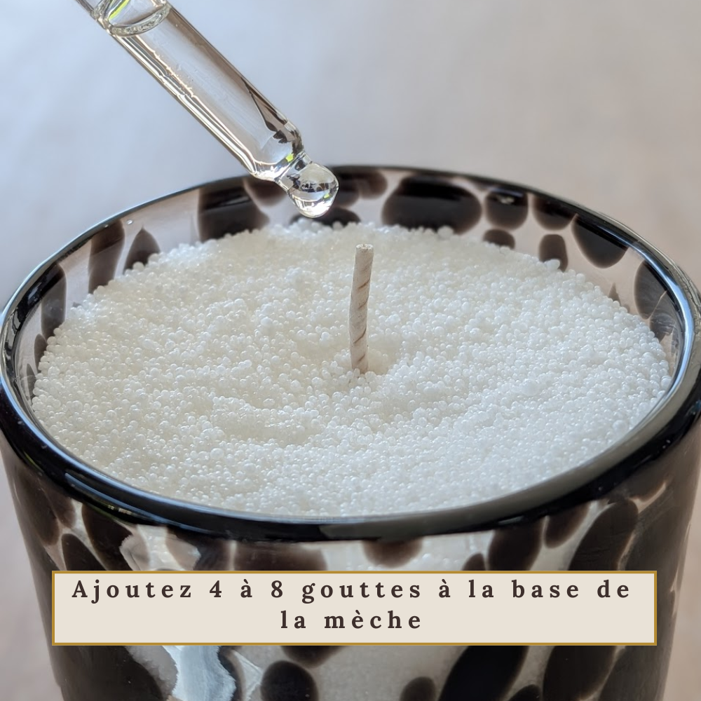 Für ein optimales Geruchserlebnis geben Sie vor dem Anzünden 4 bis 8 Tropfen des Elixiers direkt auf die Basis des Dochtes Ihrer Pearlora-Kerze.