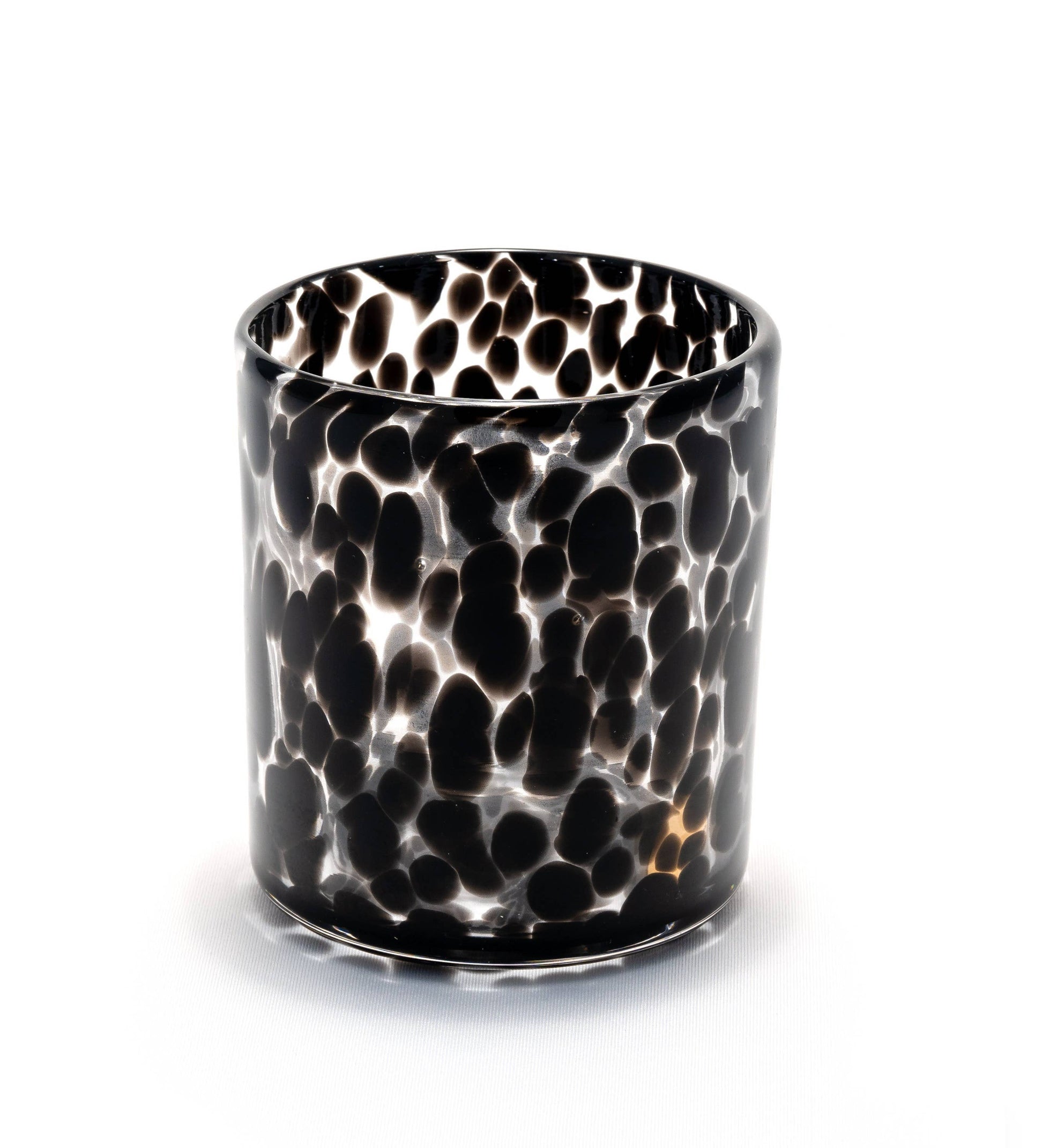 Son motif tacheté noir et blanc rappelle la grâce du guépard et crée un jeu de lumière hypnotisant une fois la bougie allumée.